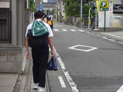 朝の登校時間、学校の東側の道路は車の交通量も多く、大変危険です。広がって歩かないように気をつけてください。白線の内側を歩くようにしてくださいね。