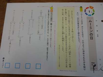 リーデイングスキル(読解力)の向上を目指して、読み方レスキューの問題にチャレンジしています。1年生は、「ムーミンの日」という文章の内容を読み取る問題でした。