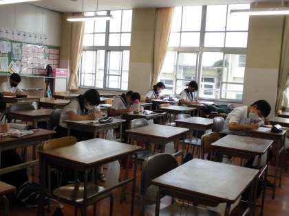 本日は暑い1日,疲れのたまった金曜日でしたが,3年生は負けずに業後の質問教室までテスト勉強に取り組んでいました。仲間同士教え合う生徒,先生に質問する生徒,黙々と学習する生徒,自分なりのスタイルで頑張って勉強しています。