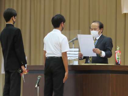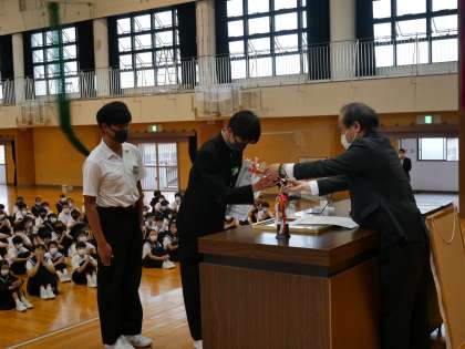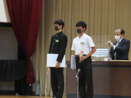 テニス部男子のペアが、春季一宮市民大会で3位入賞を果たしましたので、本日表彰しました。入賞おめでとうございました。