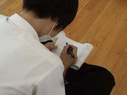 2年生は、しおりを見ながら、明日のかみいしづキャンプについての確認をしました。今日はゆっくり休んで、体調を整えて参加してほしいと思います。