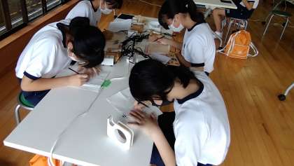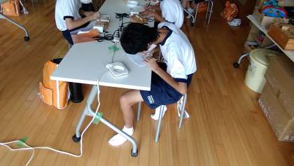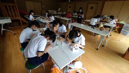 ウッドバーニングの様子です。電熱ぺんで木の板を焼いて、絵を描きます。