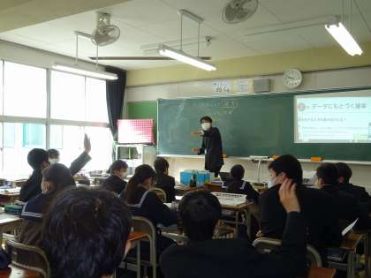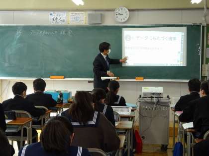 1年生の数学は、確率の勉強を進めています。自分の身近な場面で、確率を活用している場面を考え、出し合いました。