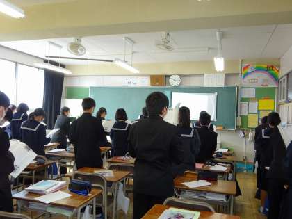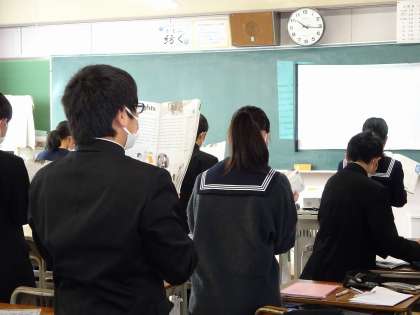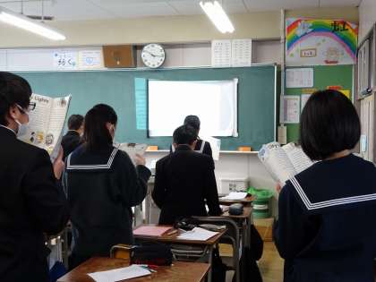 1年生の英語の授業の様子です。みんなで一斉に教科書の本文を読みました。