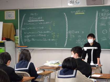 1年生の数学の授業の様子です。実物投影器で資料を提示しながら確率の勉強を進めています。