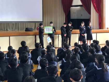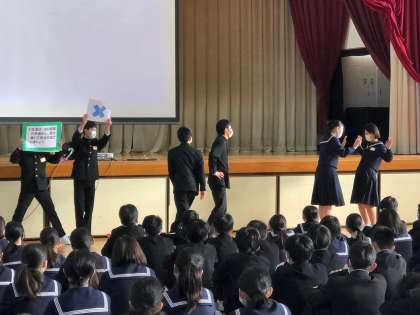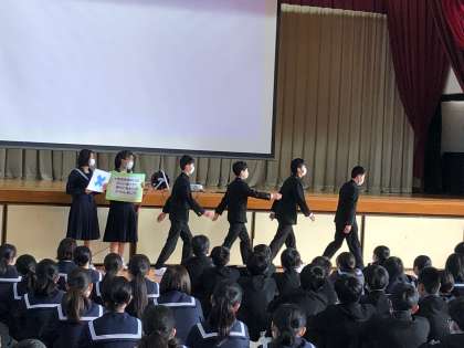 リーダー会が,これまでの学校生活の振り返りとこれからの目標について寸劇を交えた発表をしました。