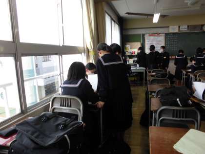 写真は登校してすぐの2年生の教室の様子です。復習テストが行われるため、カバンを置くとすぐに、周りの友達と勉強会が始まりました。勉強してきたノートを見直す生徒、教科書で問題を出し合う生徒もいました。頑張りたいという気持ちがひしひしと伝わってくる朝の教室でした。