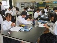 3年生の廊下には、期末テストに向けて繰り返し取り組めるよう、教科担任からのメッセージとともにテストに対策プリントが置いてあります。その応援を受けて、3年生は時間いっぱい、一生懸命にテストに取り組んでいました。