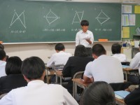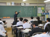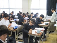 2年生の英語の授業のようすです。「相手の予定をたずねたり、自分の予定を伝えたりできるようにしよう」というめあてで学習を進めていました。