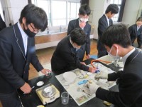 2年生の理科の授業の様子です。「化学反応と熱の関係について調べよう」というめあてで、使い捨てカイロの原理について実験で確認していました。うまく化学反応のようすを確認することができたかな。