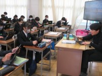 1年生の英語の授業のようすです。教科書の本文に関する問題についての解答をみんなで...