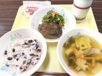 今日の給食のメニューは、赤飯、牛乳、ハンバーグのおろしがけ、なの花和え、桜のすま...