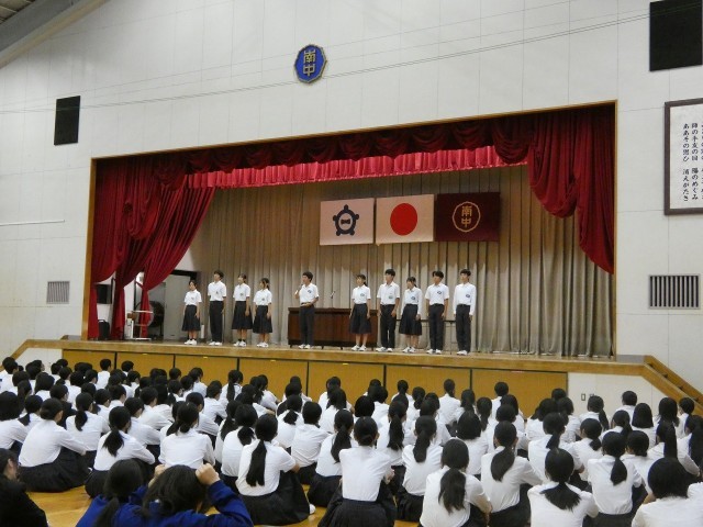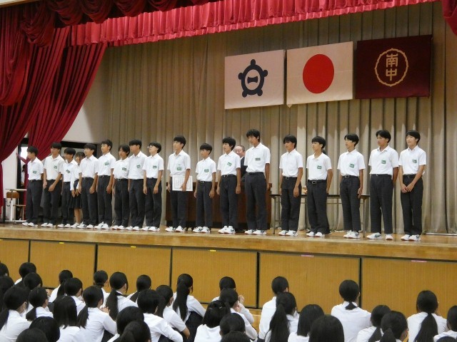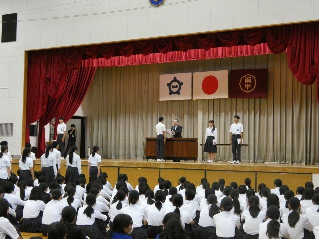 本日は午後から、学校集会で「表彰伝達と生徒会役員・学級役員任命式」、生徒集会で「生徒会役員引継ぎ式」を行いました。今日は、前期と後期の節目になります。気持ちを新たにして、後期も一緒に頑張りましょう。