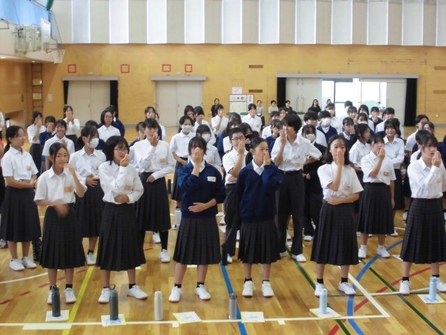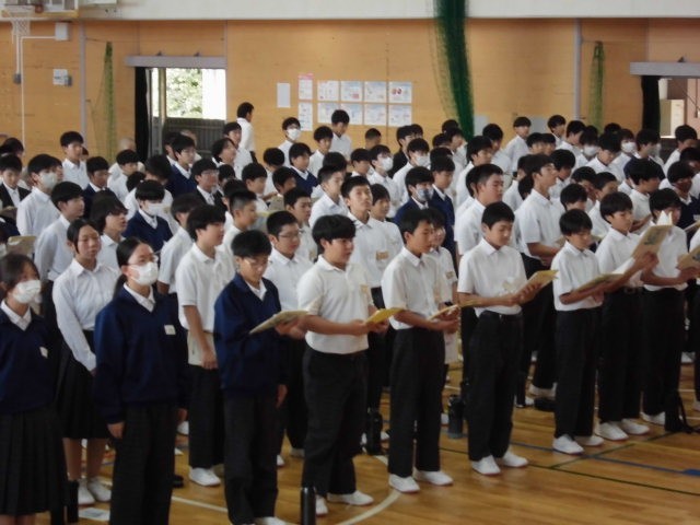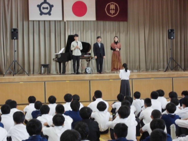本日、1・2時間目に、プロの演奏家による合唱指導を受けました。よい発声には姿勢が大切であること、お腹から声を出すには、息を吐ききってたくさん吸い込むことなど、これからの合唱練習の参考になることを教えていただきました。また、さすがプロ!と言える感動的な歌声を聴かせてもらい、本物の美しさやすばらしさを生で感じることができました。初めての合唱コンクールの練習に、本気で挑んでいくことになります。今日のこの時間が、自分をさらに高めるための時間となってくれたらうれしいです。これから一緒に頑張りましょう。