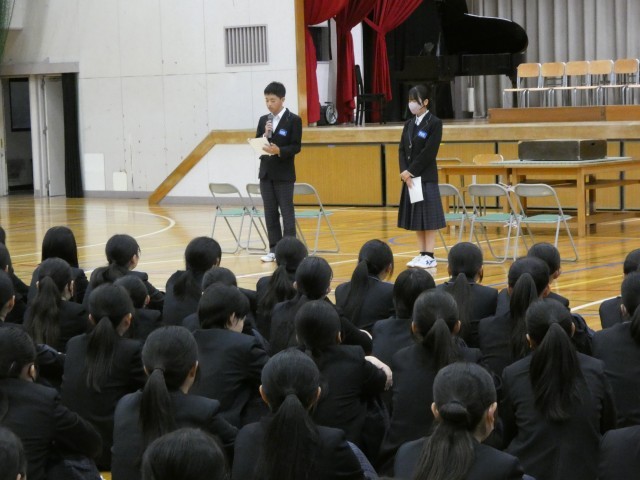 合唱コンクールに向けて本日、体育館にてリハーサルが行われました。入退場の仕方や、ナレーターや指揮・伴奏の開始のタイミングなどを確認しました。今年が、中学校生活最後の合唱コンクールとなります。本番に今までの成果を精一杯発揮してほしいと思っています。