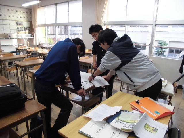 先生の机の周りには、教科書やノートを熱心に広げる生徒たち。