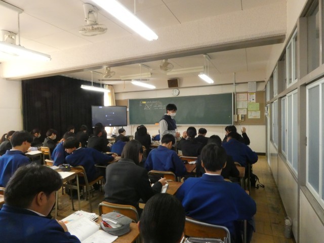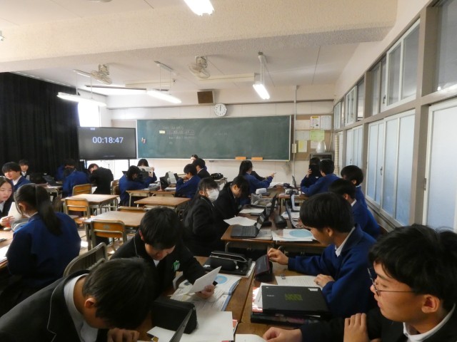 1枚目は数学の授業のようすです。基本事項を繰り返し確認をして、図形の問題にみんなで取り組んでいます。2枚目は英語の授業のようすです。スピーチテストにむけて班で何回も練習しています。
