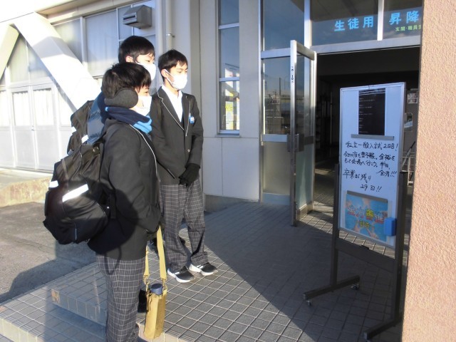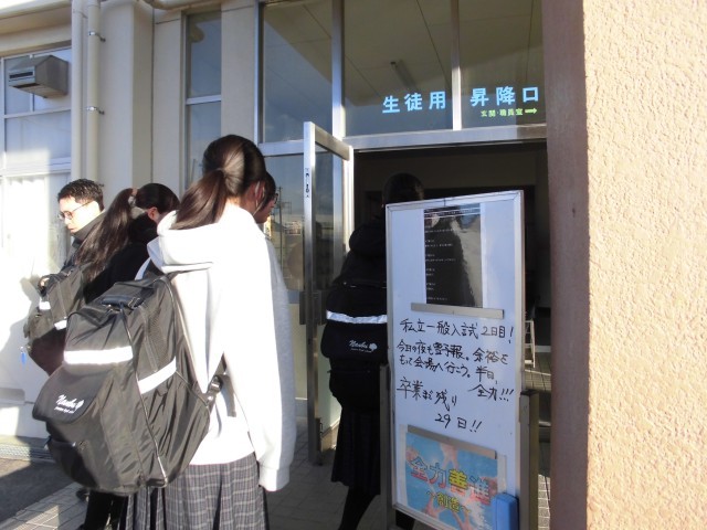 天候が心配されましたが、雪もあまり降らず無事登校していました。入試に向けて、過去問を活用し学習したり、面接練習をしたりし準備を進めることが出来ました。明日は愛知県私立入試の3日目です。ぜひ力を発揮してほしいと思います。2日目が入試のみなさん、お疲れさまでした。