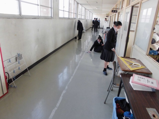 3年生フロアの清掃の様子です。登校日が日に日に少なくなっていく中、少しでも自分たちの身の回りの環境をきれいにしようと頑張っています。黙働を心掛け、自分の担当場所の清掃に集中する姿は、南部中の最高学年にふさわしいです。