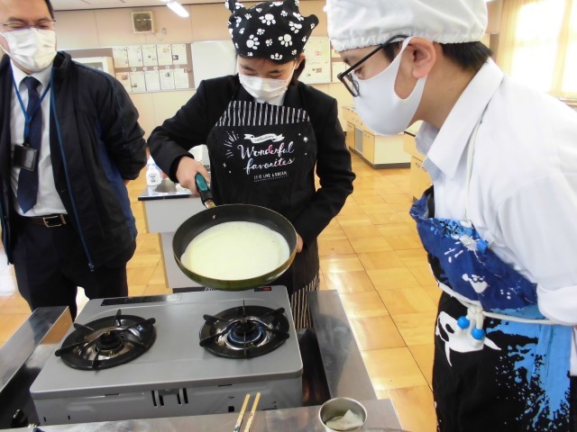 今日は調理実習でクレープを作りました。クレープ生地をフライパンに薄く広げたり、裏返したりすることに苦戦しましたが、コツをつかもうと頑張りました。焼けたクレープには、好みの具材を巻いて食べました。協力して楽しく実習ができました。