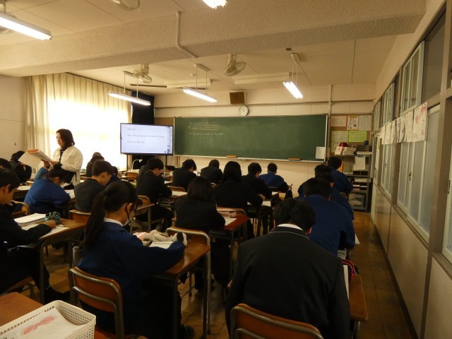 英語の授業のようすです。発音をしたり、文章を書いたりして、いろいろな方法で英語を学習しています。