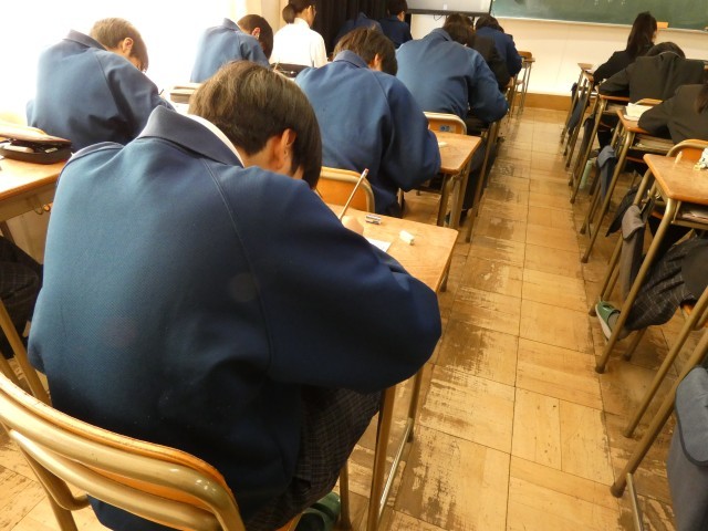 国語の授業のようすです。えんぴつを用いて丁寧に字を書く練習をしています。クラス中が真剣な雰囲気に包まれています。