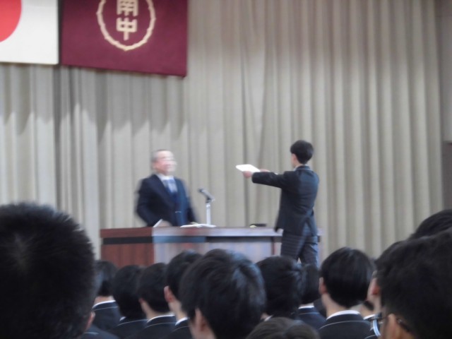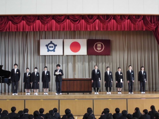 本日南部中学校では令和7年度の修了式が行われました。同時に3学期の表彰伝達や令和8年度前期生徒会の任命式が行われ、新生徒会役員が全校生徒に抱負を述べました。これから南部中学校を力強く、引っ張っていってほしいです。修了式では、校長先生より今年度の生徒の皆さんの頑張りを称えるとともに、来年度さらなる成長に向けて大切にしてほしいことについてお話がありました。この春休みは、期間は長くありませんが、来年度に向けて気持ちを整える良い期間にしてほしいです。そして、4月からの新しい生活に向け、気持ちを新たに過ごしていってほしいと思います。