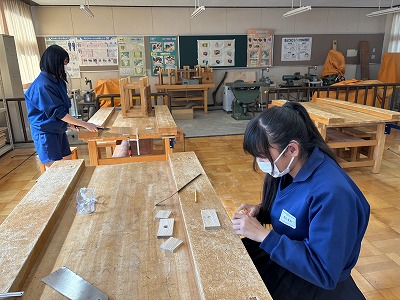 金工作業と木工作業の様子です。金工作業では、一部の生徒は真鍮ペンホルダーが完成しました。南中作品展でも展示をする予定です。ぜひご覧になってください。木工作業では、販売実習に向けてたくさんの製品が完成してきています。丁寧に製作を進めています。