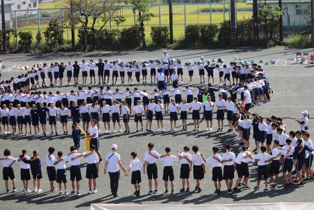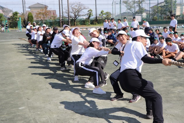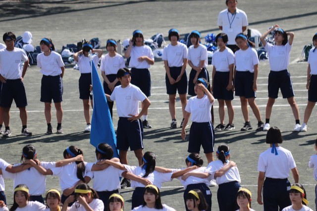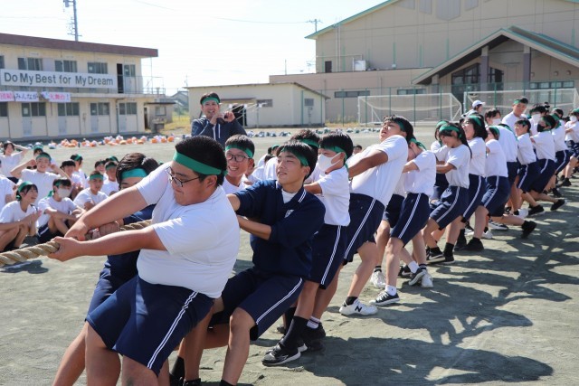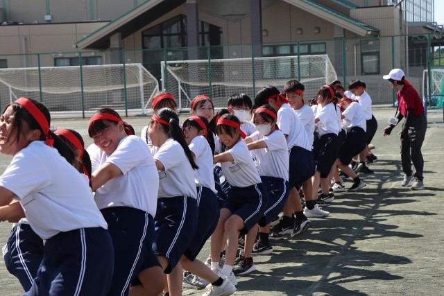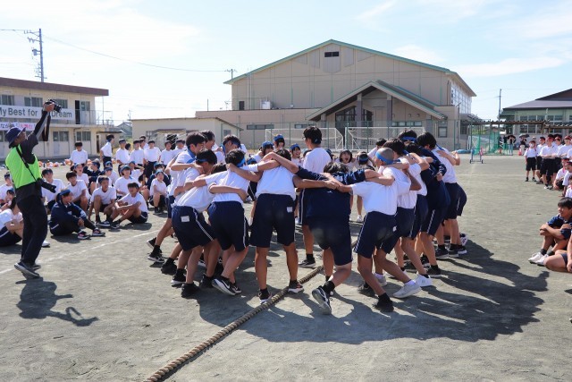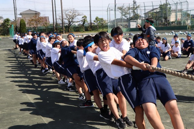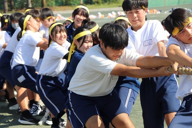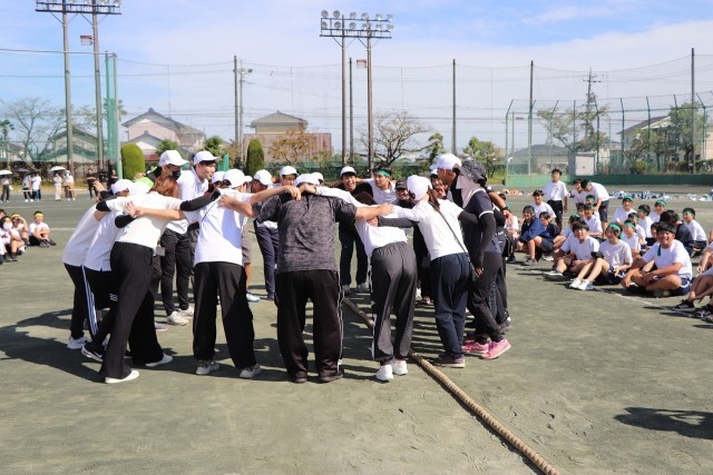 それぞれが円陣を組み、気持ちを一つにして、いざ勝負! 最初は拮抗していましたが、徐々に体力の差でしょうか、じりじり引っ張られ、最後は3年生チームが勝利しました。教職員も一緒に戦った生徒も、周りで応援をくれた群団の皆さん、保護者の皆様も、笑顔に包まれ、温かい雰囲気の中、競技を終えることができました。