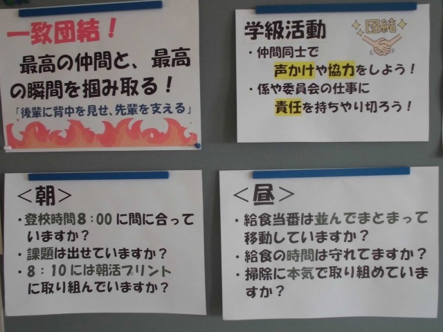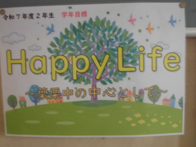 2年生の掲示板には4月に掲げた学年目標、「Happy Life」があります。10月に入り、もう一度、学年目標の実現に向け、考えてほしいという先生方の願いがあります。