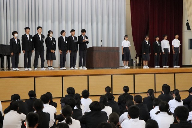 前期執行部の皆さん、先日の体育祭は競技へのアイデアを提案し、綱引きは大いに盛り上がりました。また、就任早々、積極的にあいさつ運動を行ったり、テスト週間中の教え合い活動に取り組んだりしました。その効果は着実に表れています。さらに、生徒議会では校則の見直しにも尽力しました。その取り組みは、後期の執行部にも大いに刺激になったことと思います。お疲れさまでした。