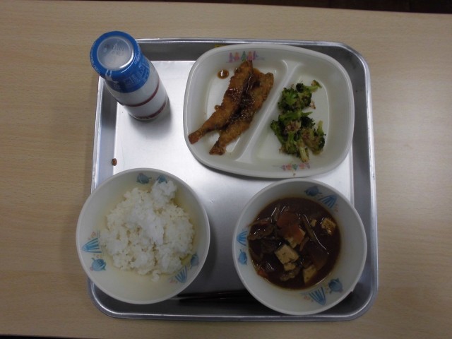 今日の給食は、ご飯、牛乳、ししゃもフライのごまだれがけ、ブロッコリーのおかか和え、ぶた汁です。