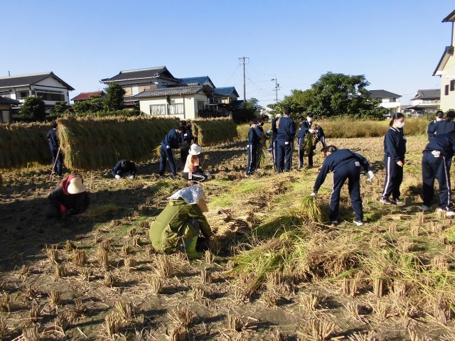 生徒たちは慣れない鎌を使いながら稲を刈り、麻ひもで縛り、はさがけをするところまで頑張りました。