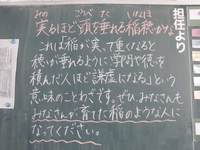 10月30日(木)実るほど頭を垂れる稲穂かな 公開日 2025/10/30 更新日 2025/10/30 葉中日記 稲が豊かに実るほど、その穂が重みで垂れ下がるように、人は学問や徳が深まるほど謙虚になるというたとえです。人格者ほど謙虚な姿勢でいることの教訓です。素敵なメッセージですね。学級背面黒板より
