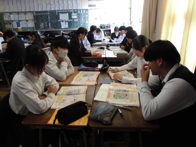 今日の社会科では、テストに向けてのプリントに真剣に取り組んだり、経済分野の「コンビニエンスストアをどこに出店すると良いか」をテーマに話し合い活動をしたりしました。