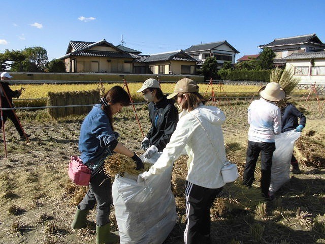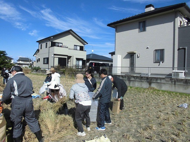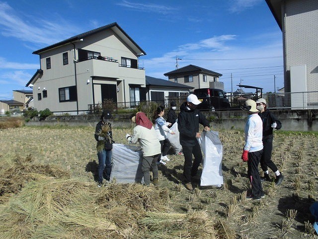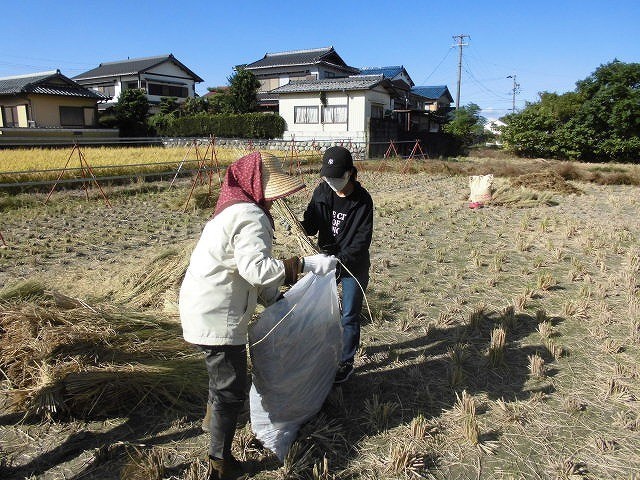 生徒が田に到着する前に、JAの方が事前に脱穀した稲わらを袋に詰めたり、はさがけで使用した支柱やポールなどを一緒に片付けていただいたりしました。