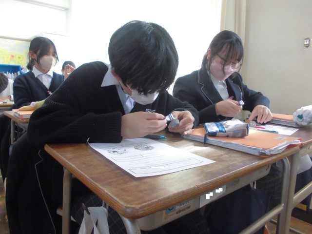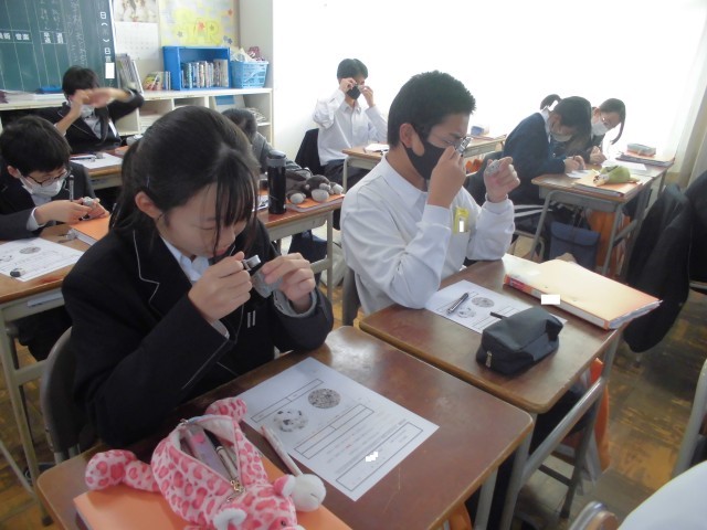 花こう岩と安山岩のつくりの違いをルーペを使って観察しました。
