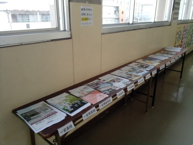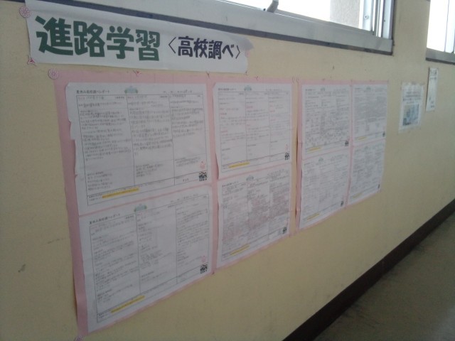 来年度の受験に向けて2年生の教室前廊下に公立高校のパンフレットを設置しました。また、自分たちで調べた高校のレポートも掲示してあります。どんな進学先があるのか視野を広げていき、目標をもって3年生に向けて、過ごしていきましょう。