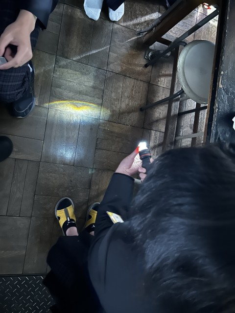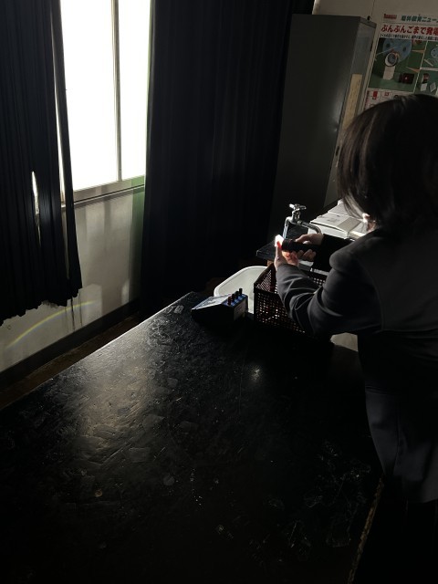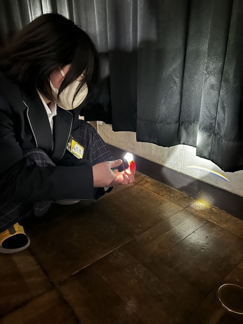 プリズムに太陽や懐中電灯の白い光を当て、どのように当てると虹ができるのか、いろいろな方法を各自で試して探しました。