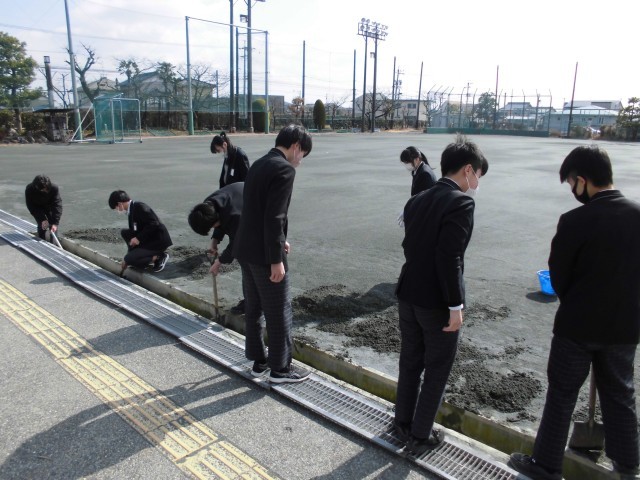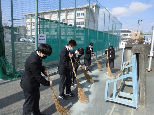 校門付近の掃き掃除に加え、側溝に溜まった砂を丁寧にかき出すなど、力のいる作業にも粘り強く取り組んでいました。