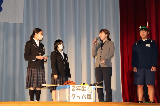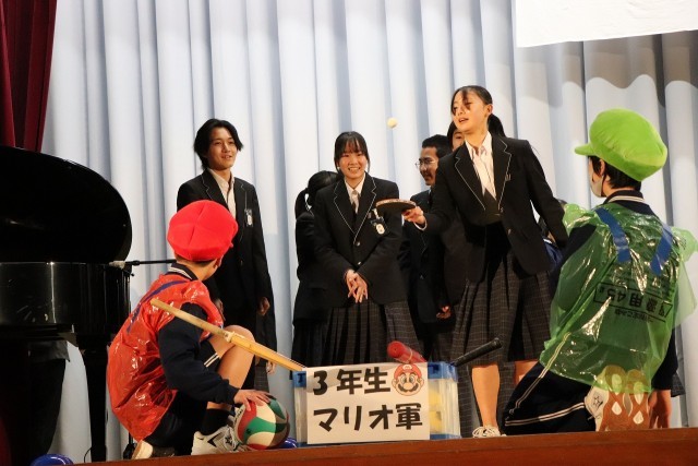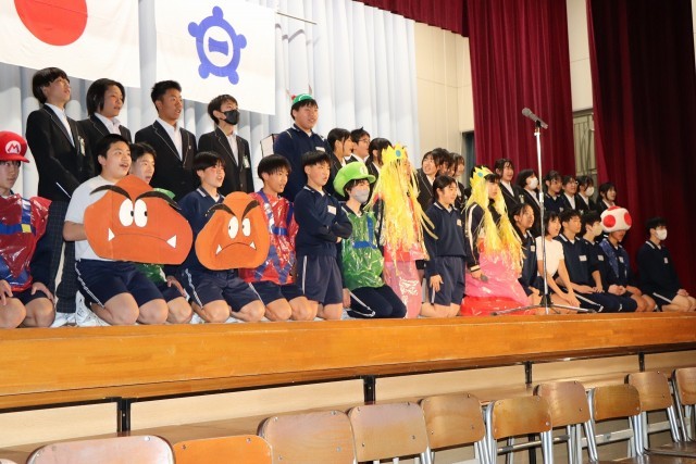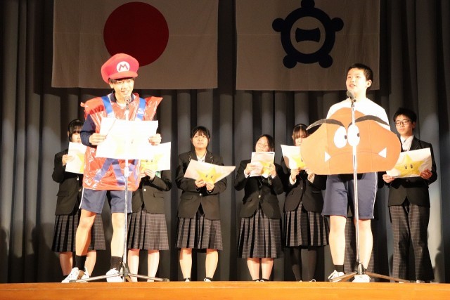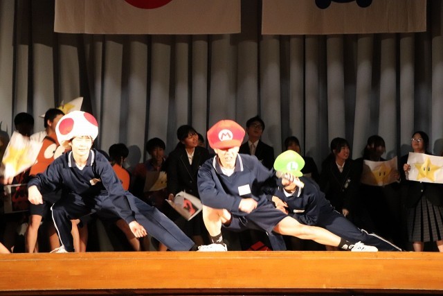 2年生はスーパーマリオの世界観をステージに広げ、クイズあり、ダンス対決あり、部活動ごとの対決ありと会場を大いに盛り上げました。3年生を爆笑の渦に引き込んでいました。映像、効果音のスタッフも準備、練習がされていて役者を支えていました。あっという間に楽しい時間が過ぎました。