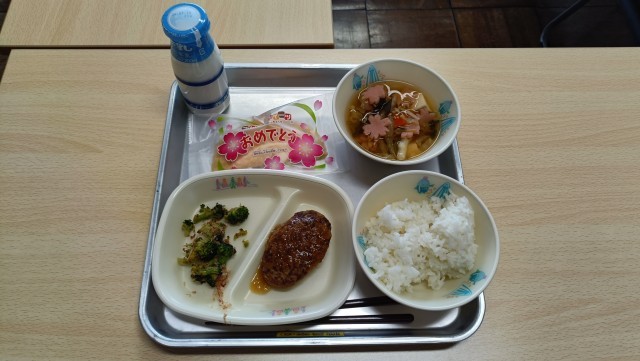 ハンバーグのおろしがけ ブロッコリーのおかか和え 桜のすまし汁 お祝いデザート(中学校のみ)