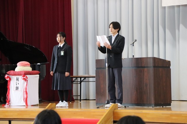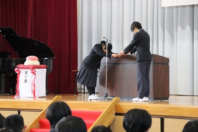 今年度2年生が田植えから育てたもち米を使い、祝い餅を3年生に贈呈しました。