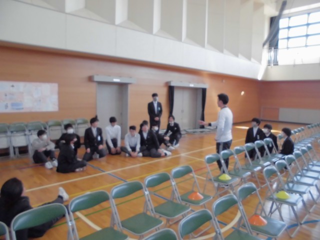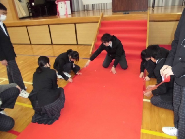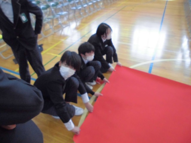 校舎まわりの清掃はもちろん、体育館内もしっかりと清掃することができました。椅子もずれのないように整列させました。特に、卒業生が歩く赤いじゅうたんの設置では、シワひとつないように丁寧に、何度も手で伸ばしながら作業する姿が印象的でした。