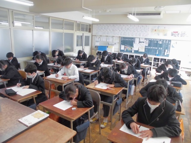 国語・社会・数学・理科・英語の5教科の2年生に向けて押さえたい内容のテストを行いました。修了式まで残り8日となり、これまでの学習を振り返りながら、1年生で学んだ内容の総復習にも取り組んでほしいと思います。