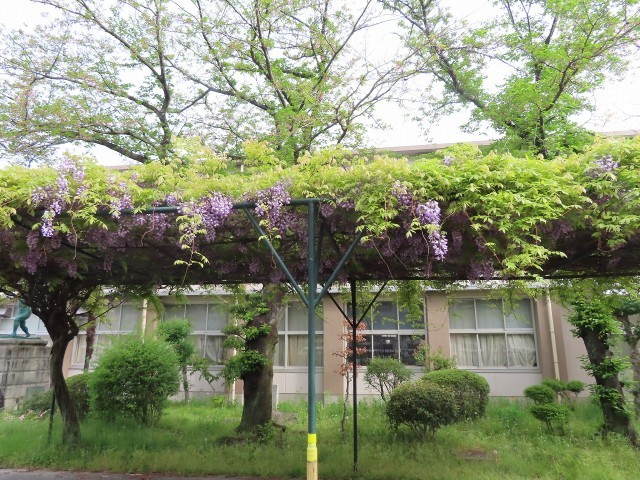 藤の花の見頃は、全国的に4月下旬から5月初旬(ゴールデンウィーク頃)が最盛期ですが、校庭の藤はすでに見ごろとなっています。