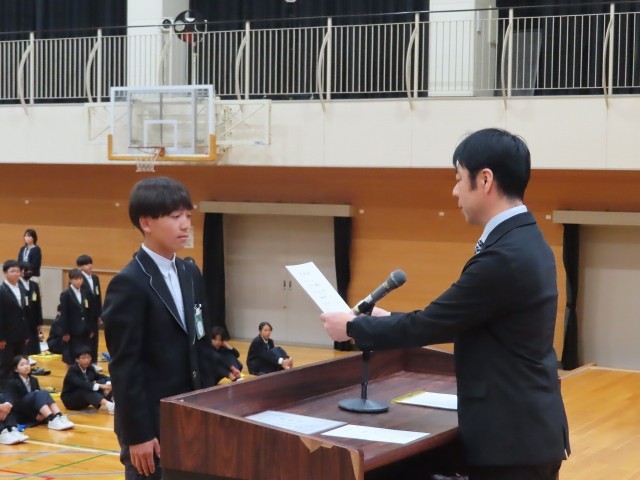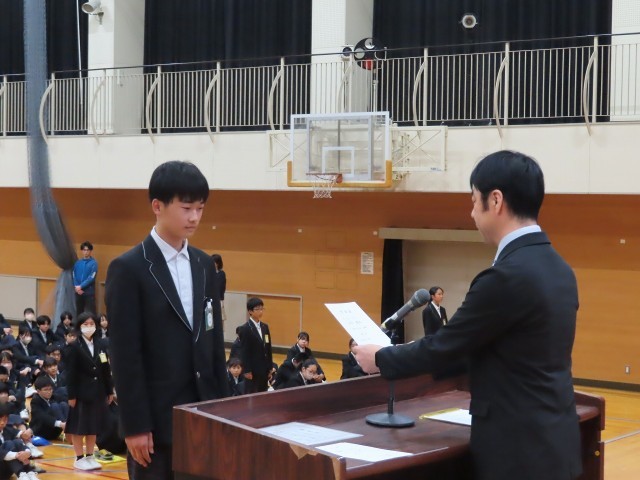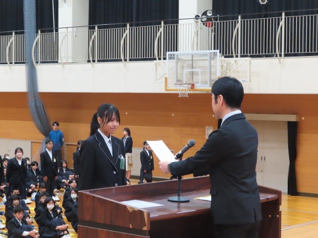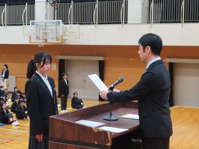 任命式では、級長、副級長、運営委員、議員の代表生徒に任命状を渡しました。