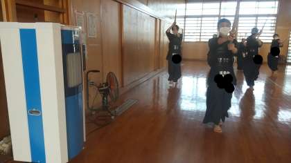 校内放送で熱中症への注意を促されて、武道場では扇風機と冷風機が早速役に立っていました。