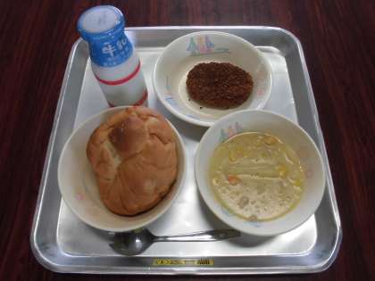 りんごパン、牛乳、コーンシチュー、ミンチカツ