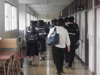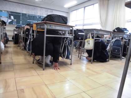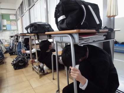 本日、今年度最初の避難訓練を行いました。地震が発生したという想定のもと、先生の指示にしがたって机の下にもぐって頭部を守る訓練を行いました。誰一人ふざけることなく真剣に訓練に取り組むことができました。あいにくの雨で、運動場に避難することはできませんでしたが、教室から校舎の外に出るまでの避難経路をしっかりと確認することができました。